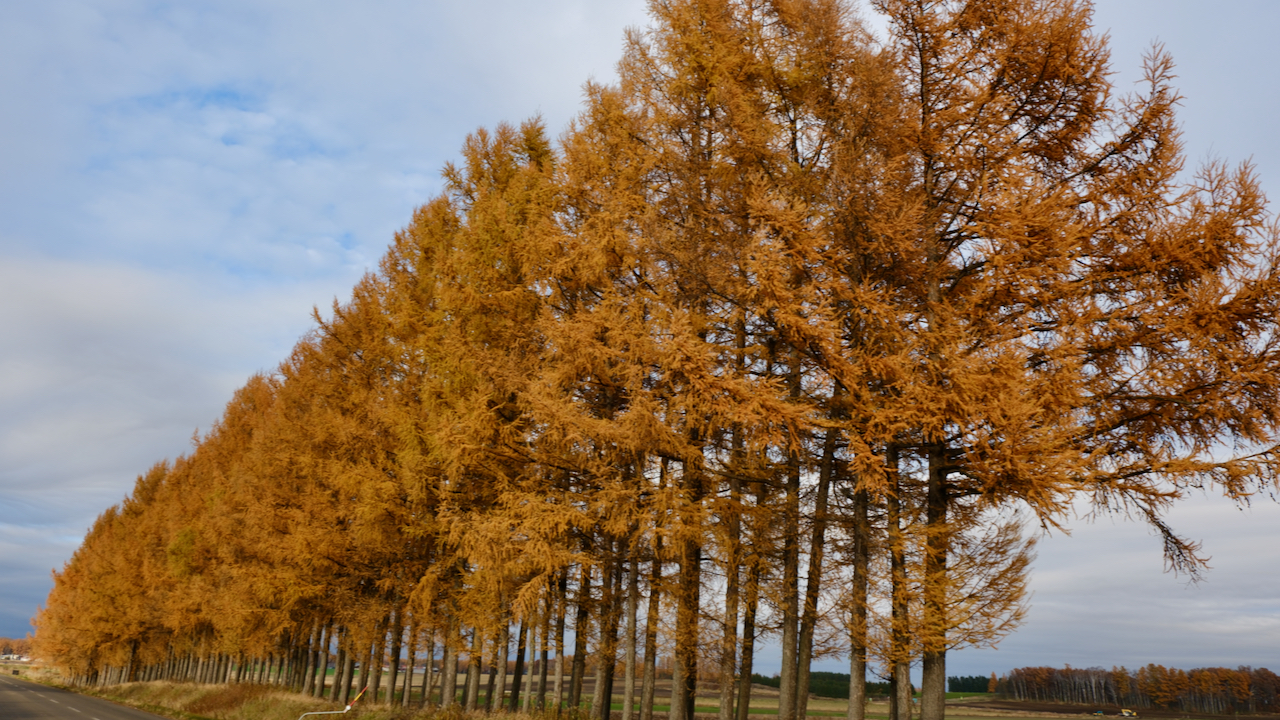 カラマツの防風林は春から夏の終わりまで、くすんだ緑の細く短い針のような葉をつけているときはさほど目を惹く樹木ではありませんが、冬が訪れる直前に見せるこの輝きは圧倒的です。これは先週の日曜日に撮ったもの。今日は、これで今年最後の見納めになるかもしれないと海まで車を走らせました。その写真はいずれまた。